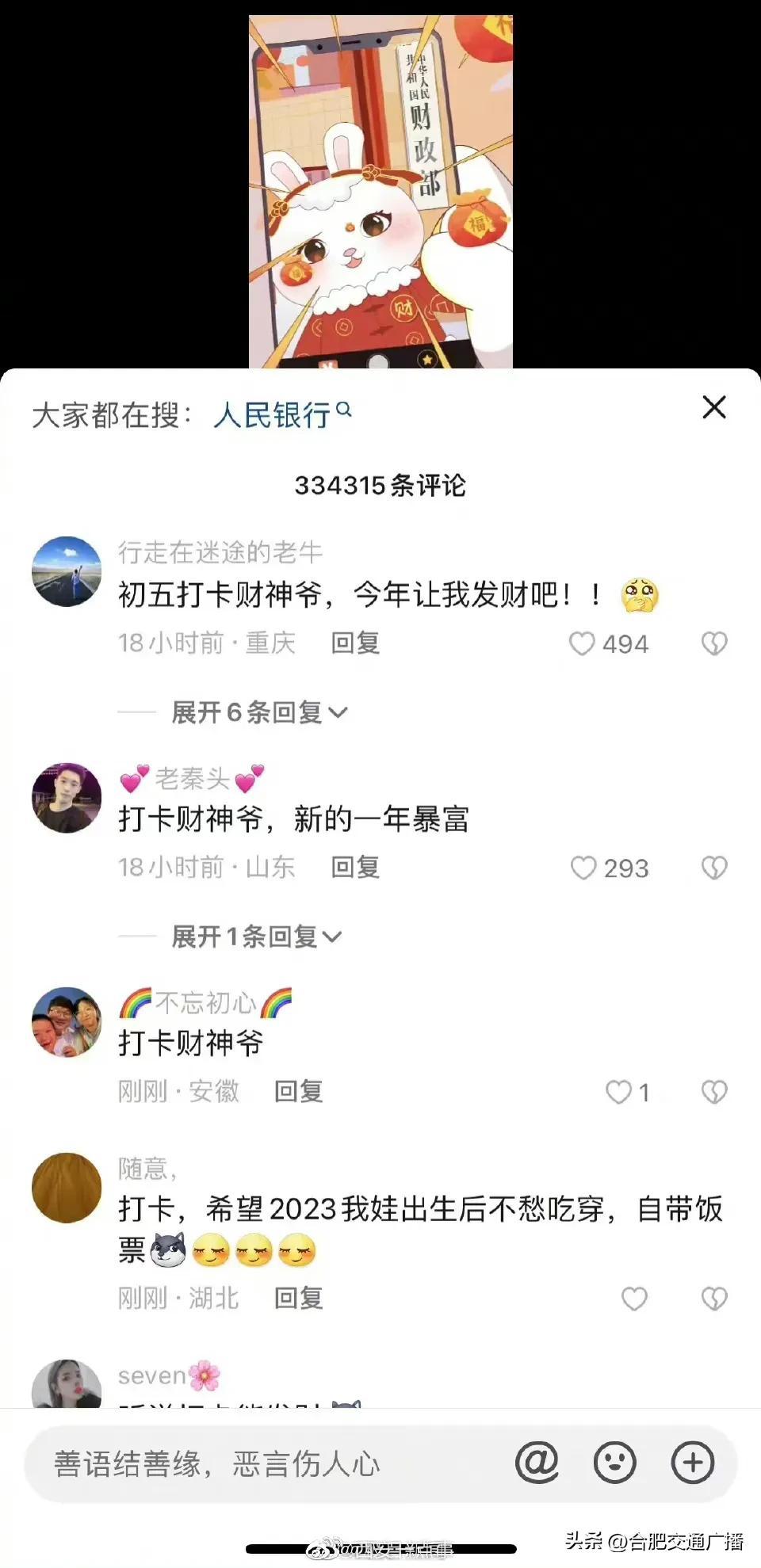 大年初五财政部账号成网友打卡地(网友纷纷给“真财神爷”花式留言) 2023-01-26 热点新闻 9826 作者:网友投稿 今天(1月26日)正月初五,是很多地方“迎财神”的日子。财政部在今天发了一条“都来打卡财政部”的动画短视频,引来网友们的点赞和转发,祈求新年“财运亨通”。